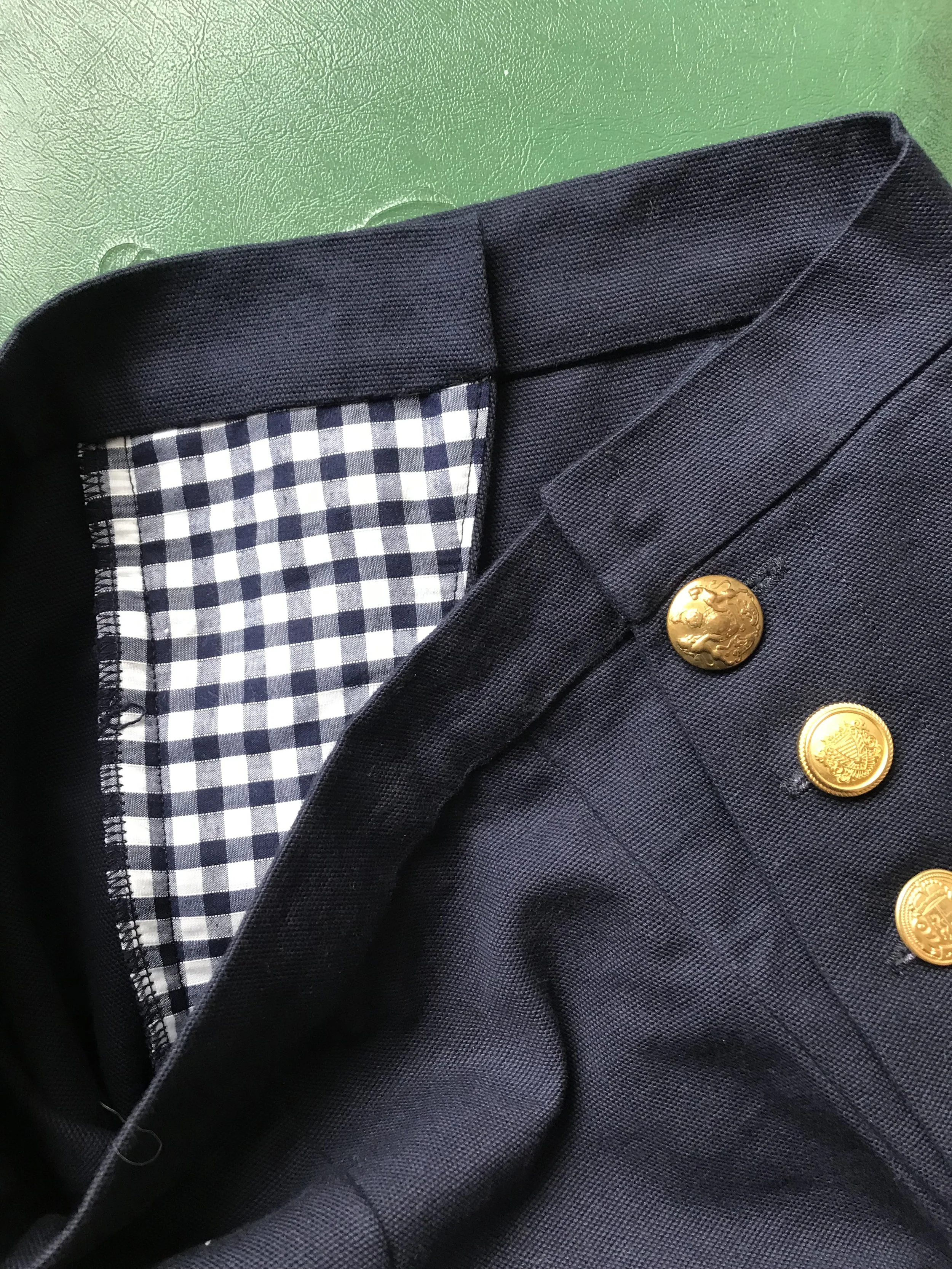 These trousers have a double button front, with five buttons each side and two internal poppers at the waistband. The insides are faced with gingham, to keep the bulk down. The fabric is a weighty cotton canvas.